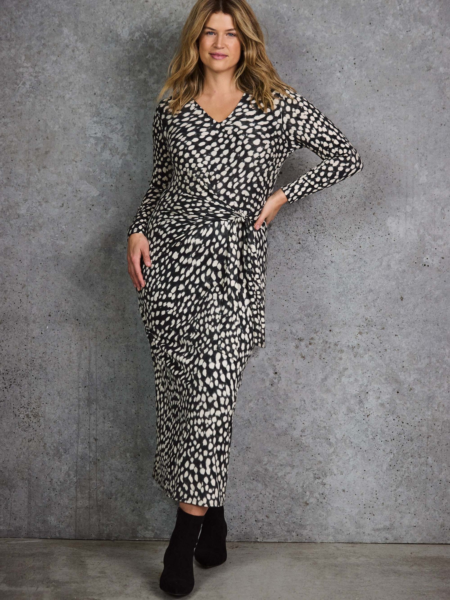 In a gorgeous Black Animal Print this jersey dress is such an easy throw-on-and-go piece to add to your wardrobe. It has an ever so flattering V neckline and a beautiful tie side detail that adds so much elegance to this dress. The maxi length and long sleeves offer such an elevated sihouette making this the perfect piece to either dress up or down.