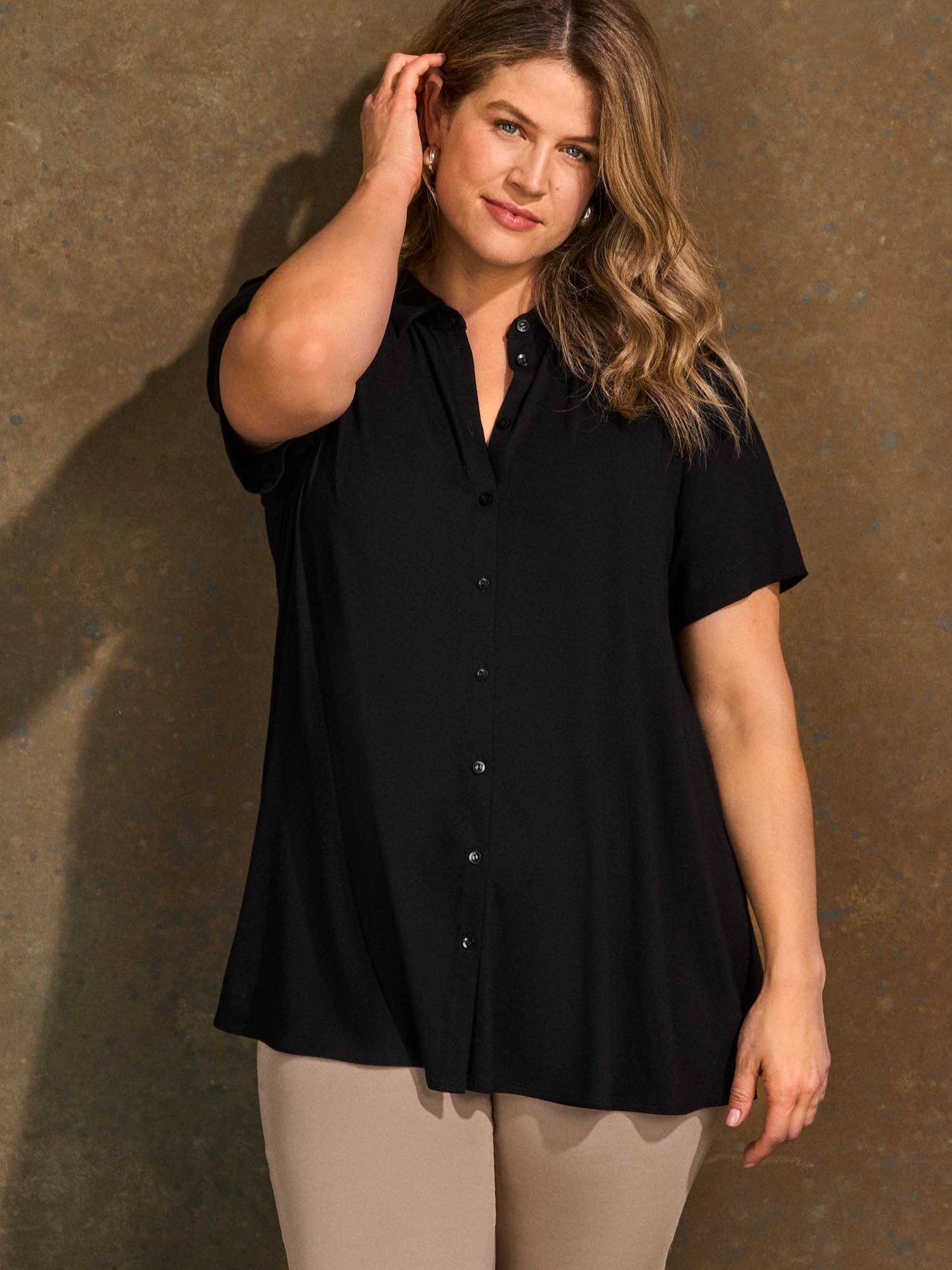 A versatile addition to your everyday wardrobe, this jersey shirt is designed with a clean, relaxed silhouette. It features a classic collar and button-through front, while the soft jersey fabrication offers comfort with a hint of stretch. Finished with short sleeves, style yours with tailored trousers or denim for an easy, polished look.