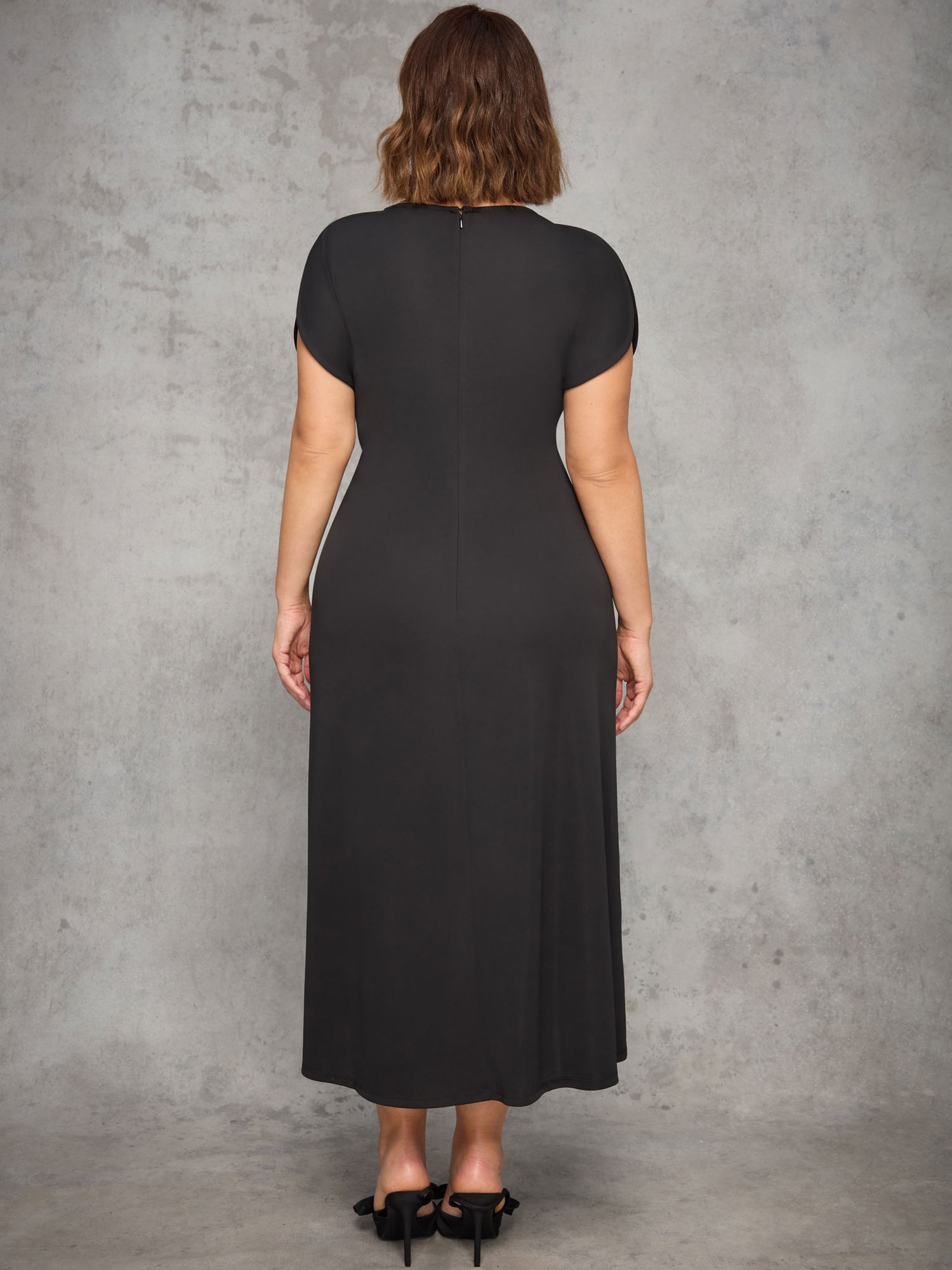 The Black Draped Side Midaxi Dress features a flattering slash neckline and short sleeves for a sleek, elegant silhouette. With a ruched waist detail that enhances your shape, this maxi-length dress flows gracefully to the floor. An invisible zip fastening at the side ensures a seamless fit, making it a sophisticated choice for evening events or special occasions.