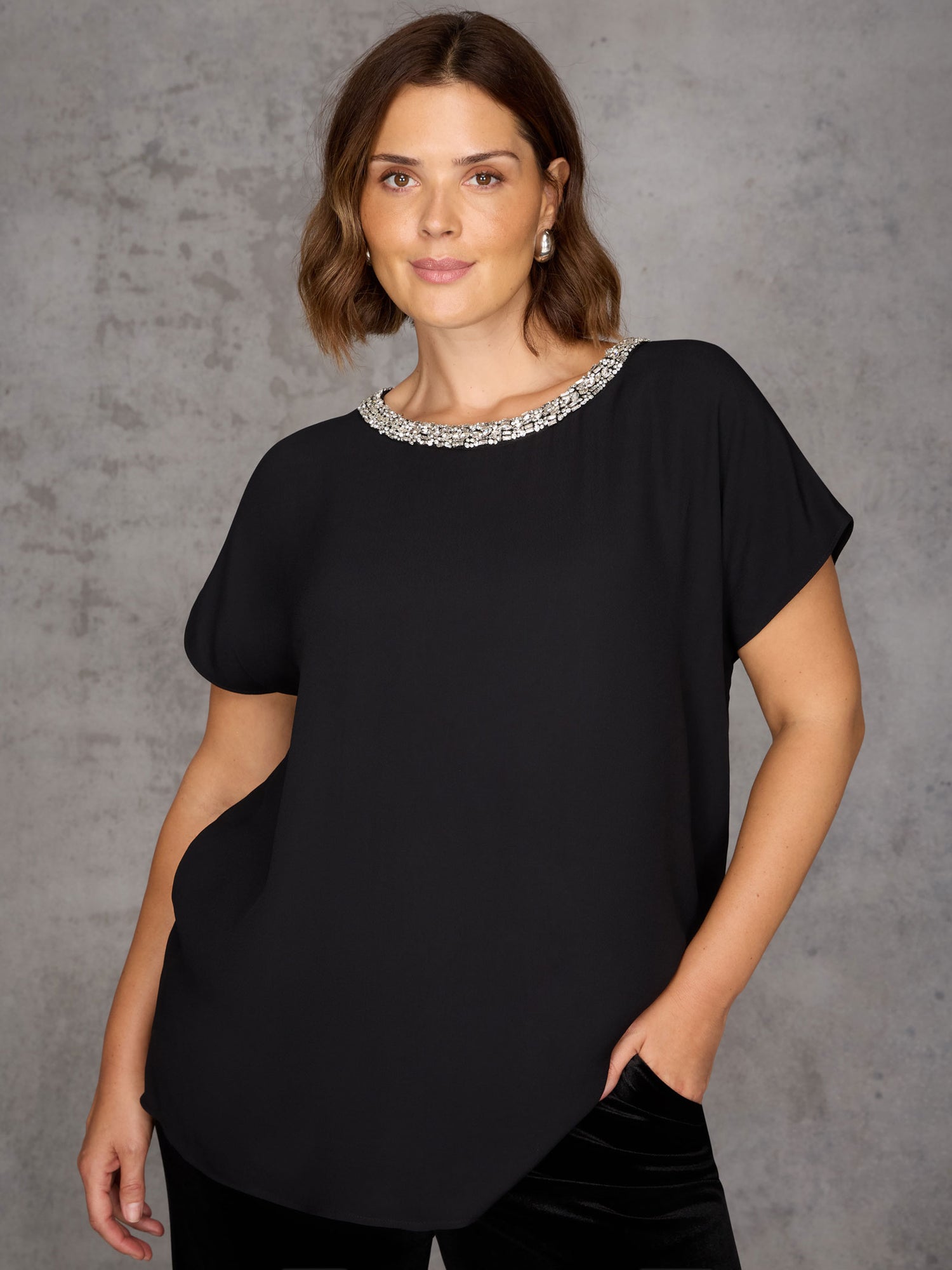 Featuring a sparkling embellished crew neckline, this top elevates any outfit with subtle glamour. It has grown-on short sleeves for a relaxed fit, crafted in luxurious satin back crepe fabric for a smooth drape. Side splits add ease of movement and a modern touch, making it perfect for both day and evening wear.