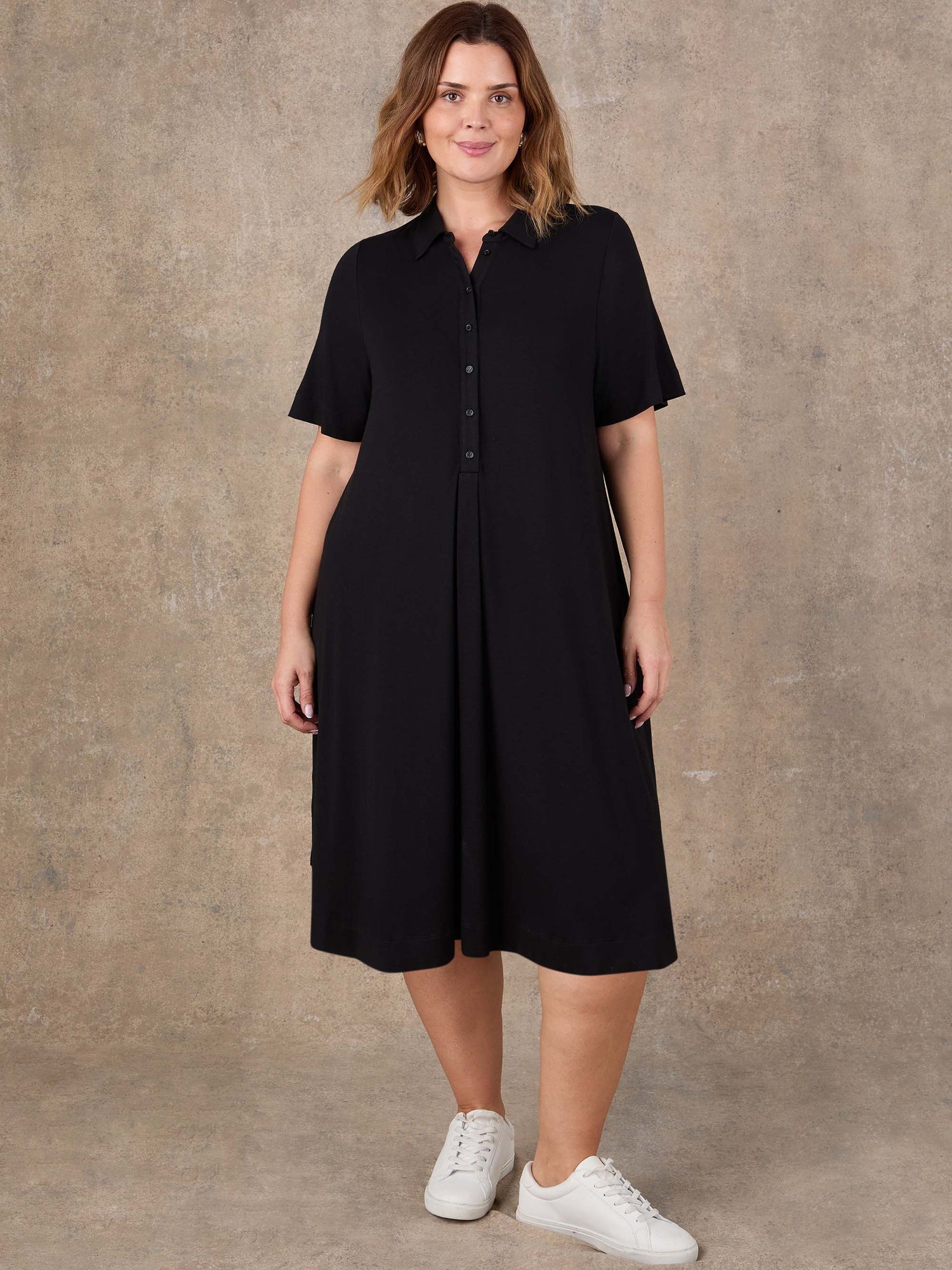 Designed with everyday ease in mind, this black shirt dress offers a relaxed take on a classic silhouette. Featuring a collar neckline with a half placket, it has a clean, understated look that feels effortlessly put together. The box pleat detail adds subtle shape and movement, while the short sleeves keep it easy and wearable. Crafted from soft jersey fabric, it’s comfortable to wear all day and slips on with ease. Style with trainers for casual days or add boots for a more polished finish. A versatile dress that balances comfort with simple, modern style.