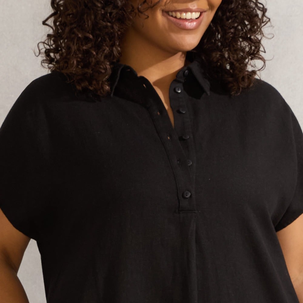 The functional button placket allows for an adjustable neckline