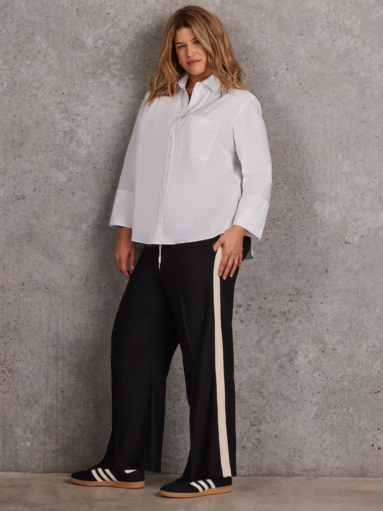 These black wide-leg trousers combine comfort with contemporary style. An elasticated waist with an adjustable drawstring ensures a perfect fit, while the wide-leg silhouette and contrast grosgrain side stripe add modern flair. Practical pockets and a slip-on design make them effortless to wear. Perfect for pairing with a blouse or sweater, they can be dressed up or down, creating a versatile look.