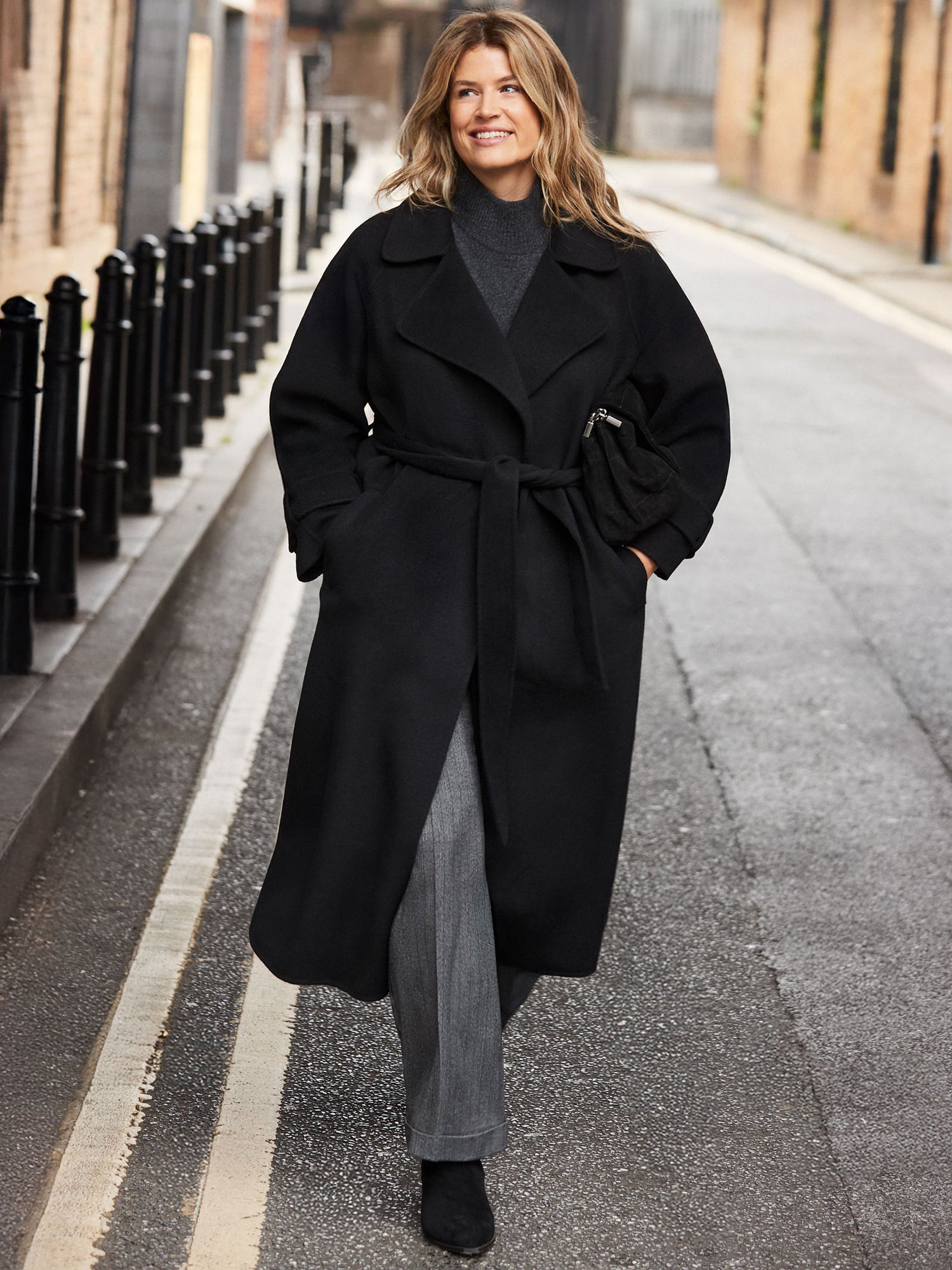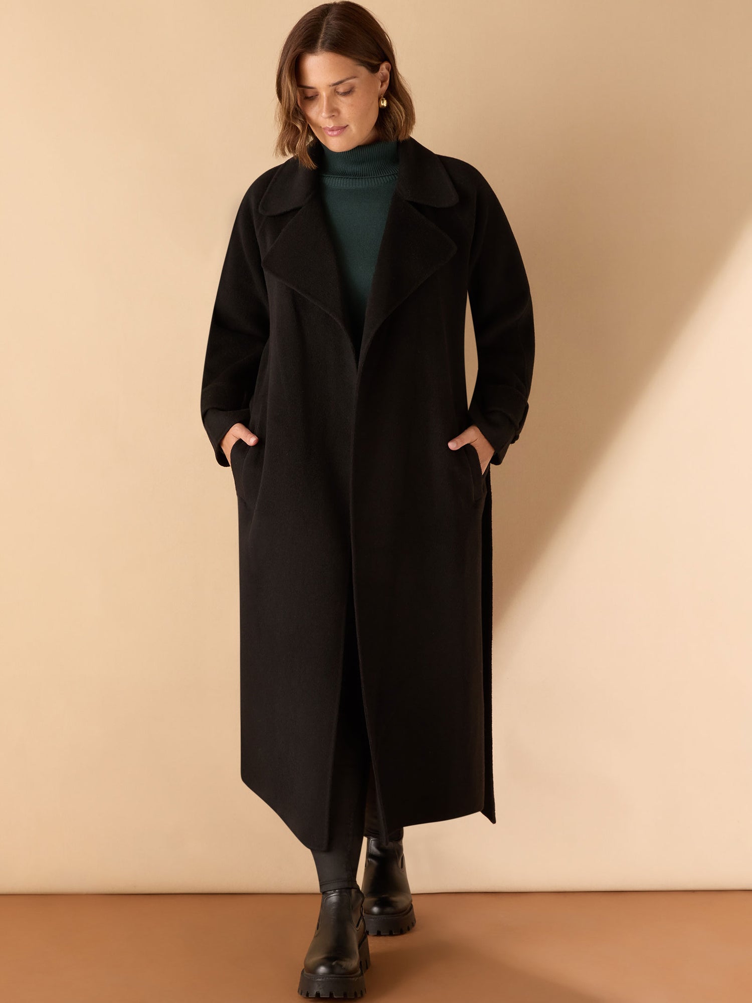 Wrap up in timeless style with this Black Wool Blend Belted Coat, cut from luxurious double-faced wool fabric for warmth and softness. Designed with long raglan sleeves and a flattering tie waist, it offers a relaxed yet elegant silhouette. The longline cut and practical pockets make it perfect for layering through the colder months, combining comfort with effortless sophistication.