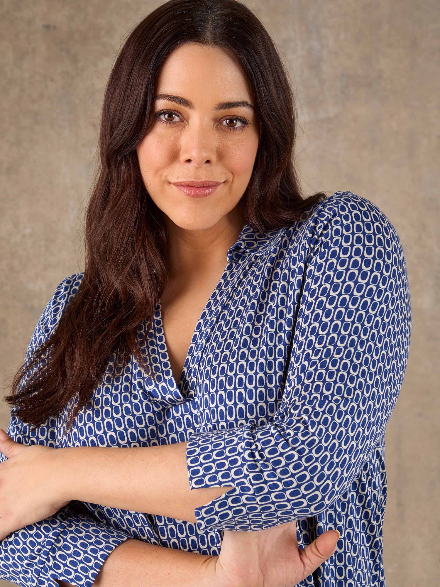 Crafted from soft stretch jersey for all-day comfort, this collared top features a flattering V-neckline with a button-through front for a polished yet relaxed feel. Designed with short sleeves and finished in a bold blue geo print, it’s an easy everyday piece that works just as well with tailored trousers as it does with denim.