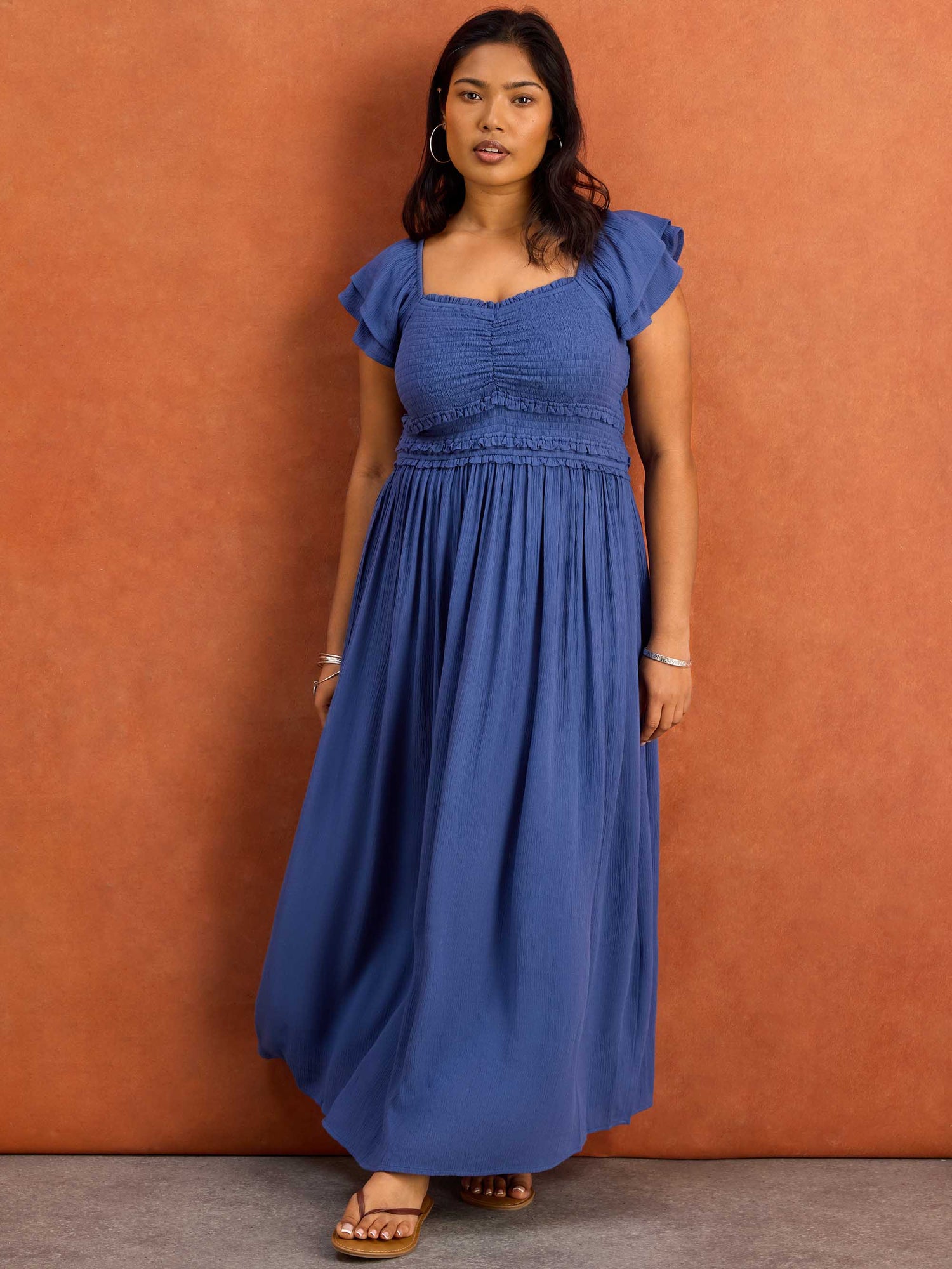 This blue smocked maxi dress is designed to feel effortless while still looking beautifully put together. The shirred bodice offers a flexible, comfortable fit, balanced by flutter sleeves that add gentle shape and coverage through the arms. Crafted in lightweight crinkle fabric, it falls easily into a flowing maxi length, with side seam pockets adding a practical touch. Finished with subtle trim detailing, it’s an easy slip-on style that works just as well for relaxed daytime plans as it does for more elevated occasions.