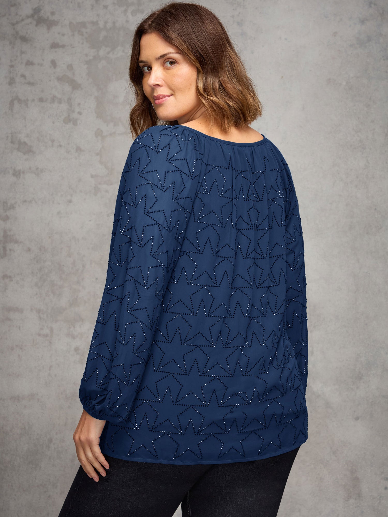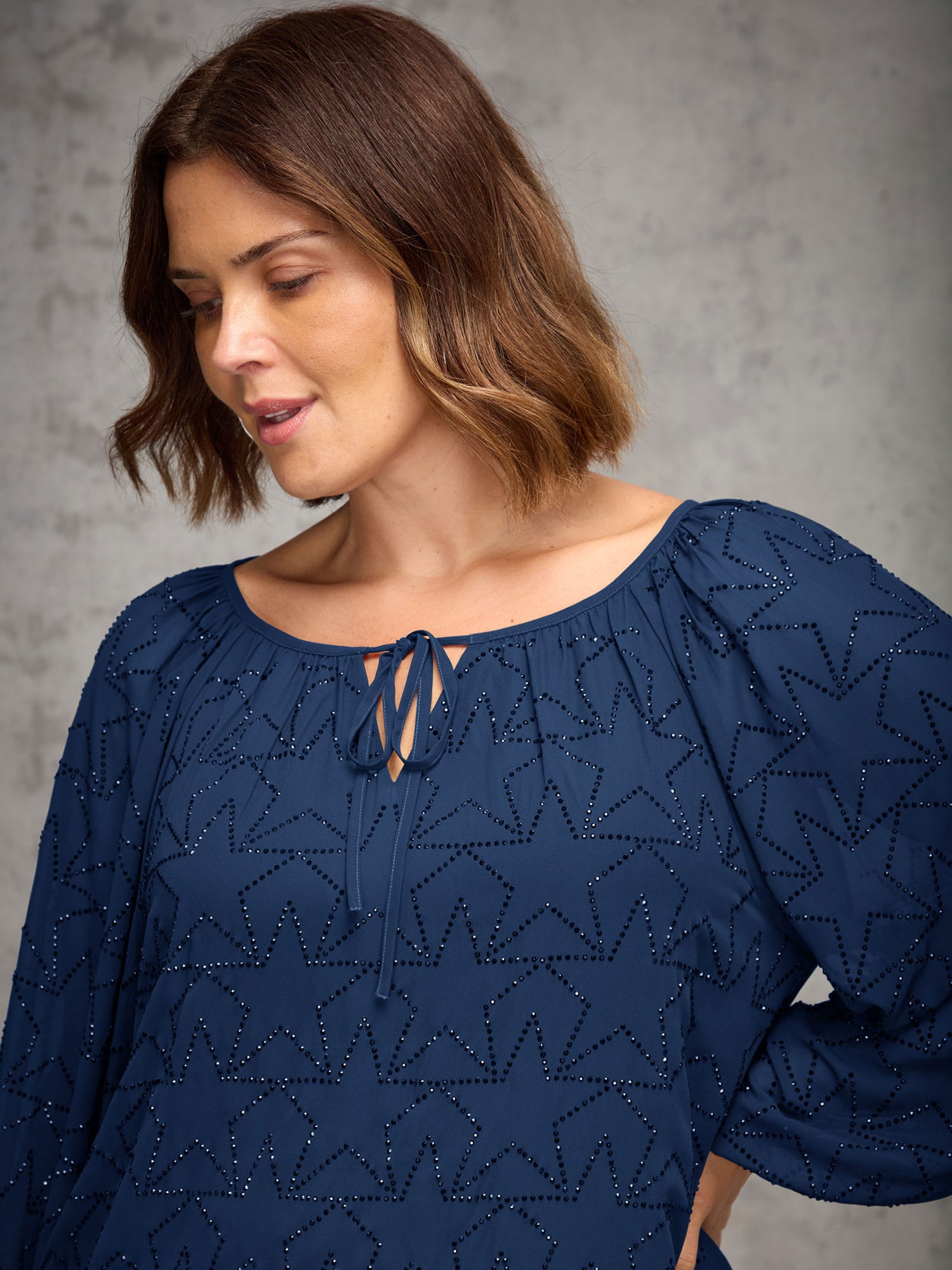 Featuring a softly gathered neckline with a delicate tie detail, this embellished top offers effortless glitz. The long blouson sleeves with elasticated cuffs create a flattering, feminine silhouette, while the fully lined fabric ensures comfort and ease of wear. Subtly sparkling, it’s perfect for dressing up tailored trousers or adding glamour to sleek denim, the perfect choice for evenings out and refined day-to-night style.