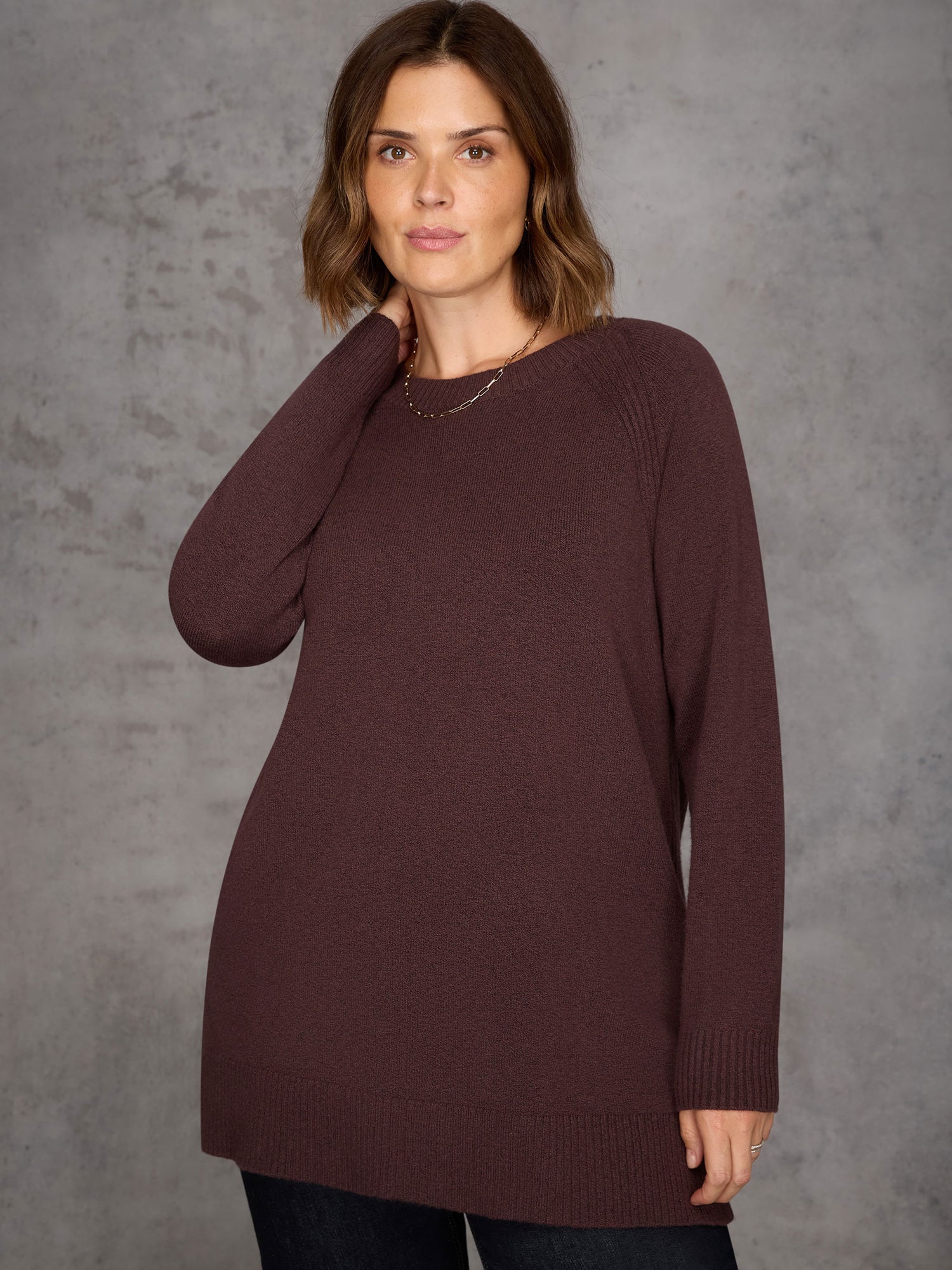 Warm and versatile, this Brown Crew Neck Longline Knitted Jumper features a classic crew neckline and long raglan sleeves for a relaxed fit. Finished with ribbed trims at the neckline, cuffs, and hem, its longline design makes it perfect for layering over leggings or jeans for effortless everyday style.