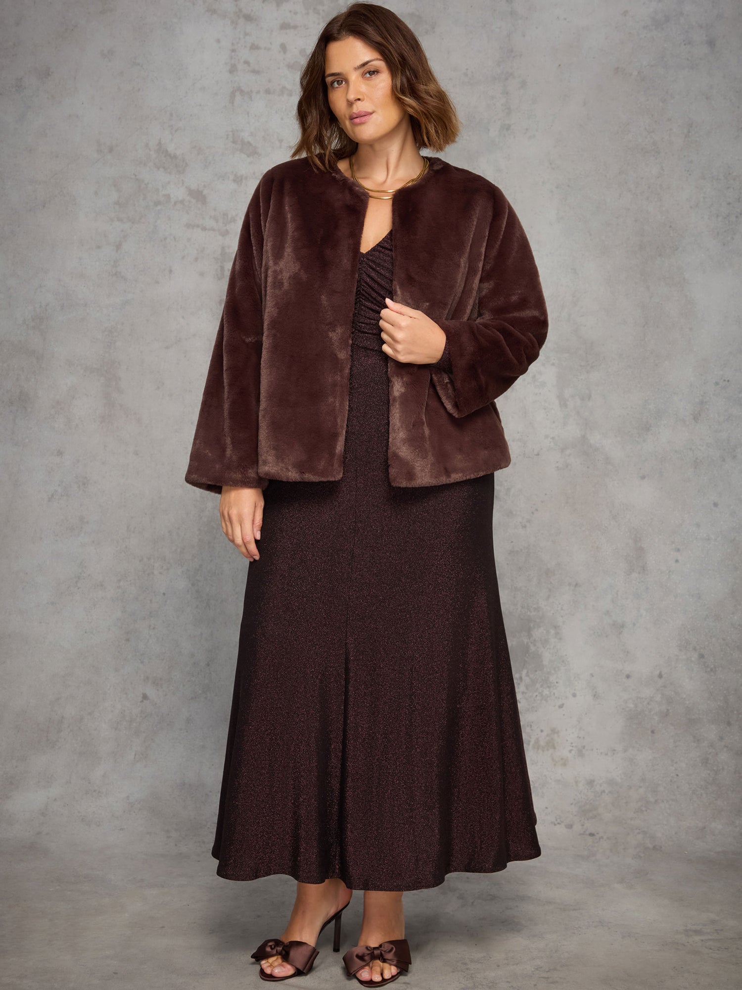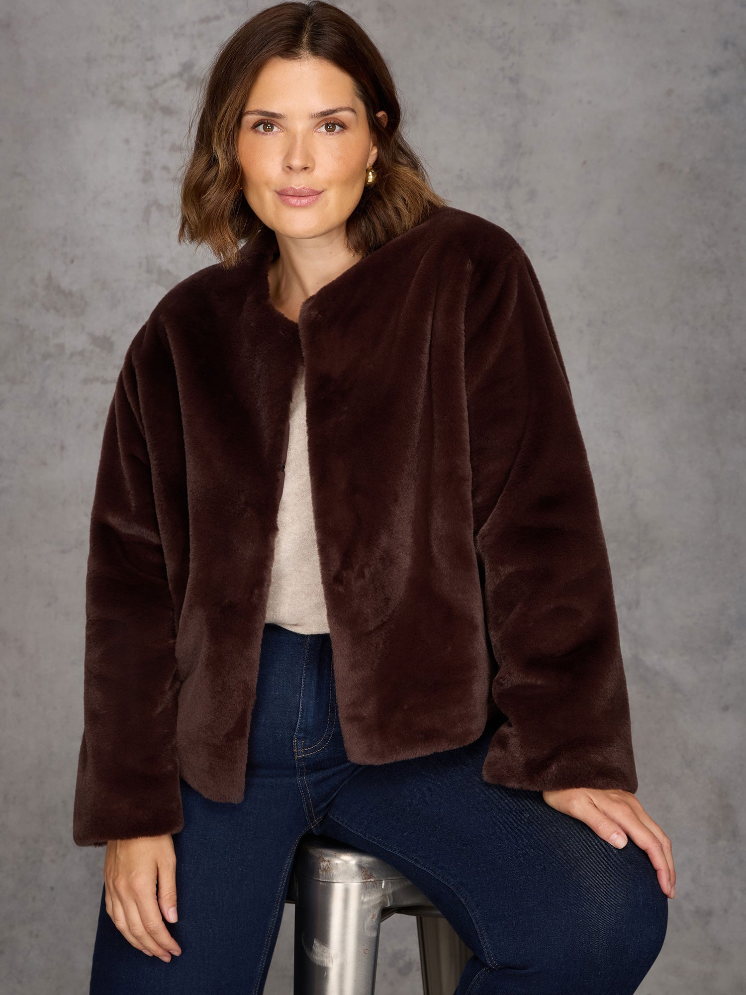 Luxuriously soft and stylish, this Brown Faux Fur Jacket features a classic round neckline and long sleeves for a timeless silhouette. With secure hook and eye fastenings and a fully lined interior, it offers both warmth and comfort. Perfect for adding a touch of elegance to your cold-weather wardrobe.