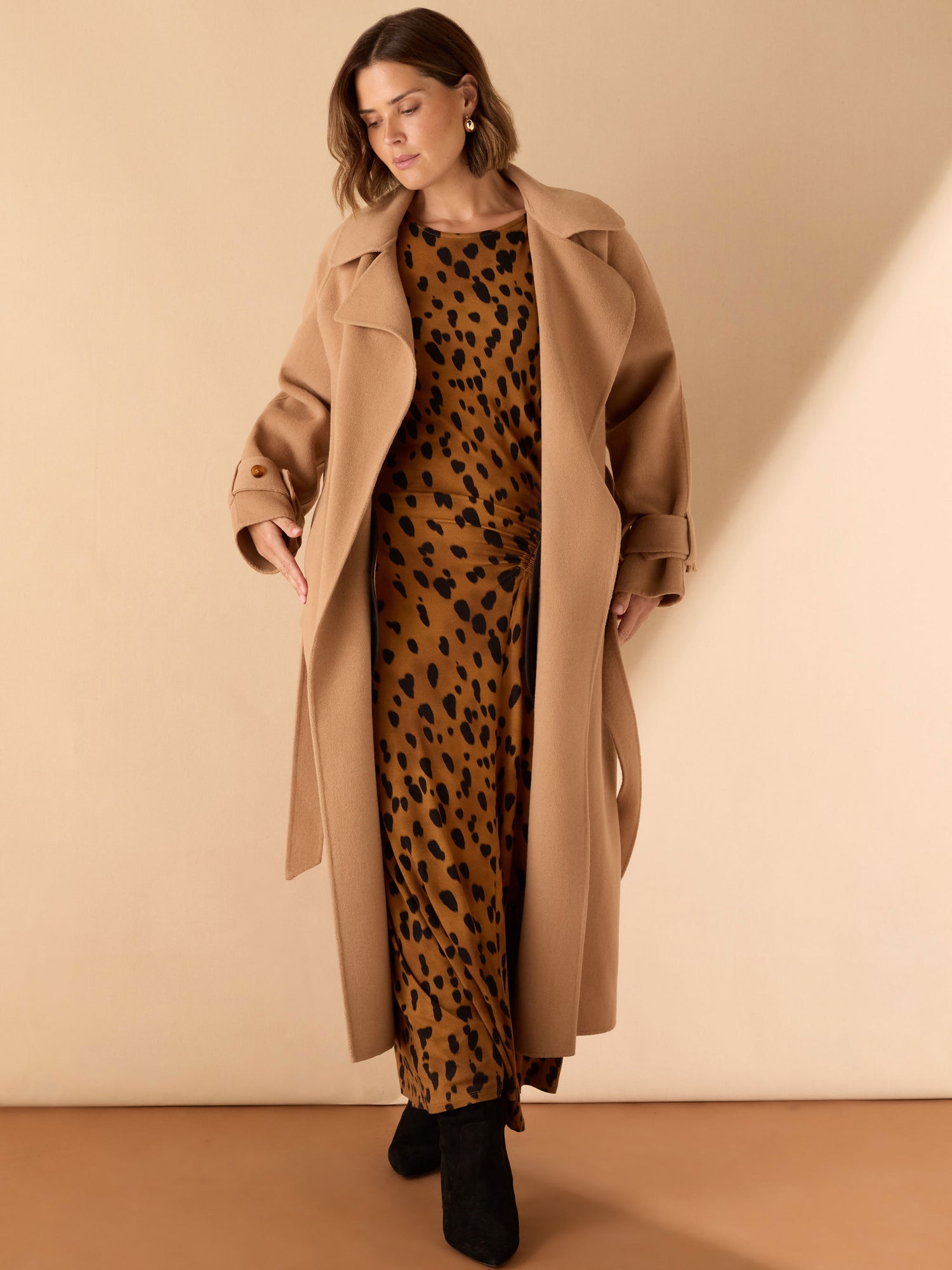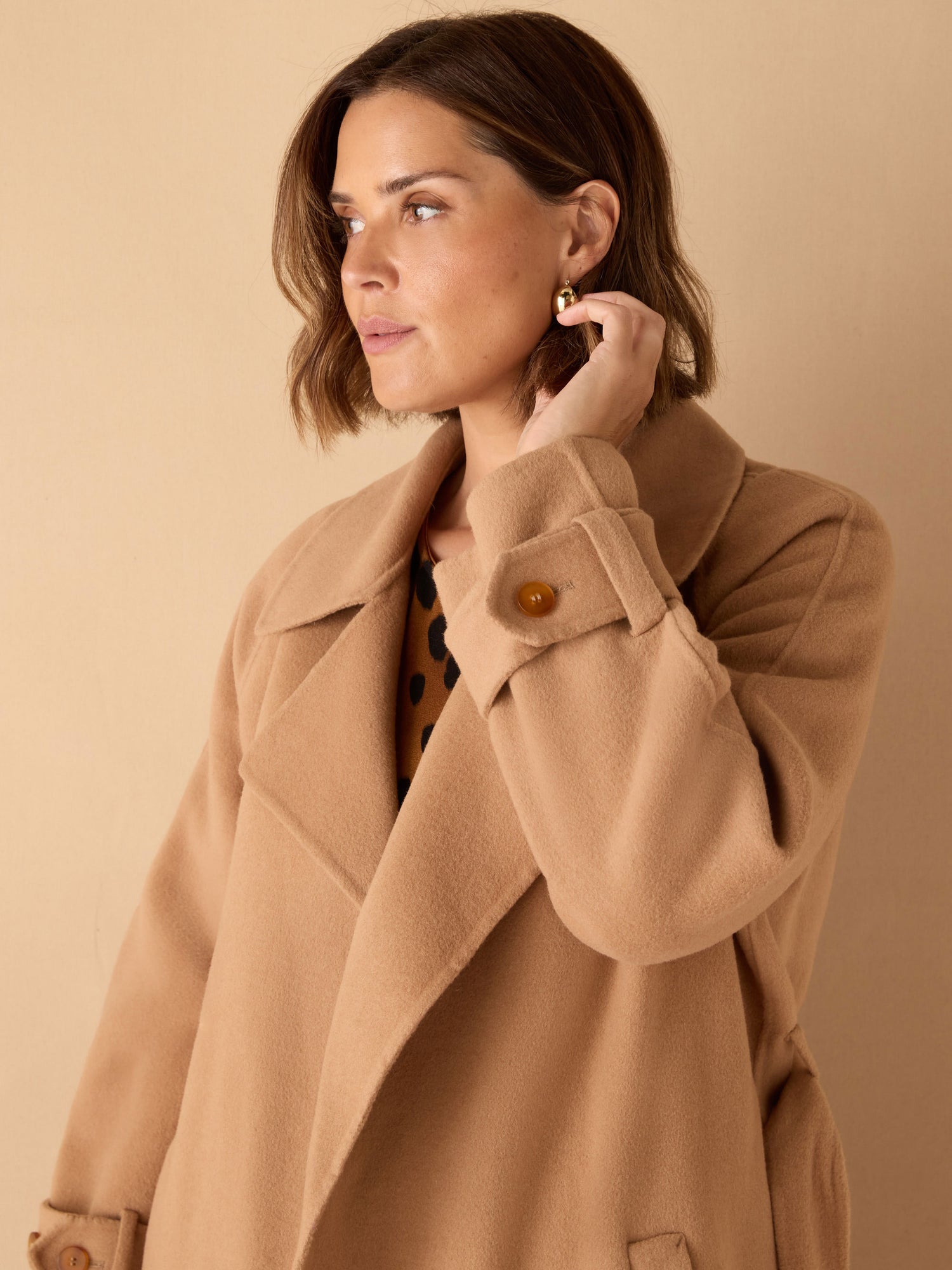 Wrap up in timeless style with this Camel Wool Blend Belted Coat, cut from luxurious double-faced wool fabric for warmth and softness. Designed with long raglan sleeves and a flattering tie waist, it offers a relaxed yet elegant silhouette. The longline cut and practical pockets make it perfect for layering through the colder months, combining comfort with effortless sophistication.