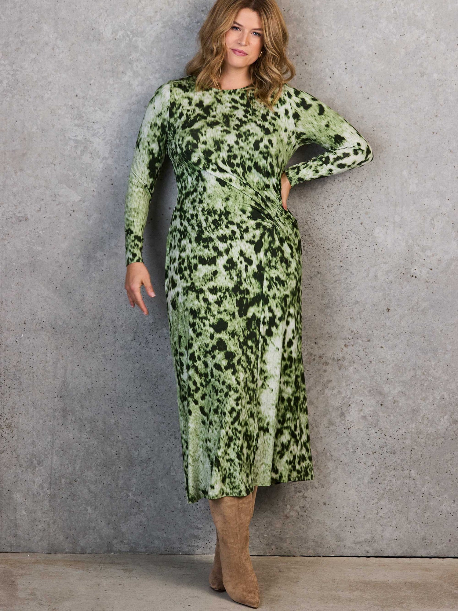 Turn heads in this bold animal abstract print dress, crafted from soft, stretch jersey for a flattering fit that moves with you. Featuring a classic crew neckline and long, slim sleeves, it’s designed with ruched detailing through the body to accentuate your shape. Effortless to wear with a pull-on style, this dress brings comfort and style together in one striking piece.
