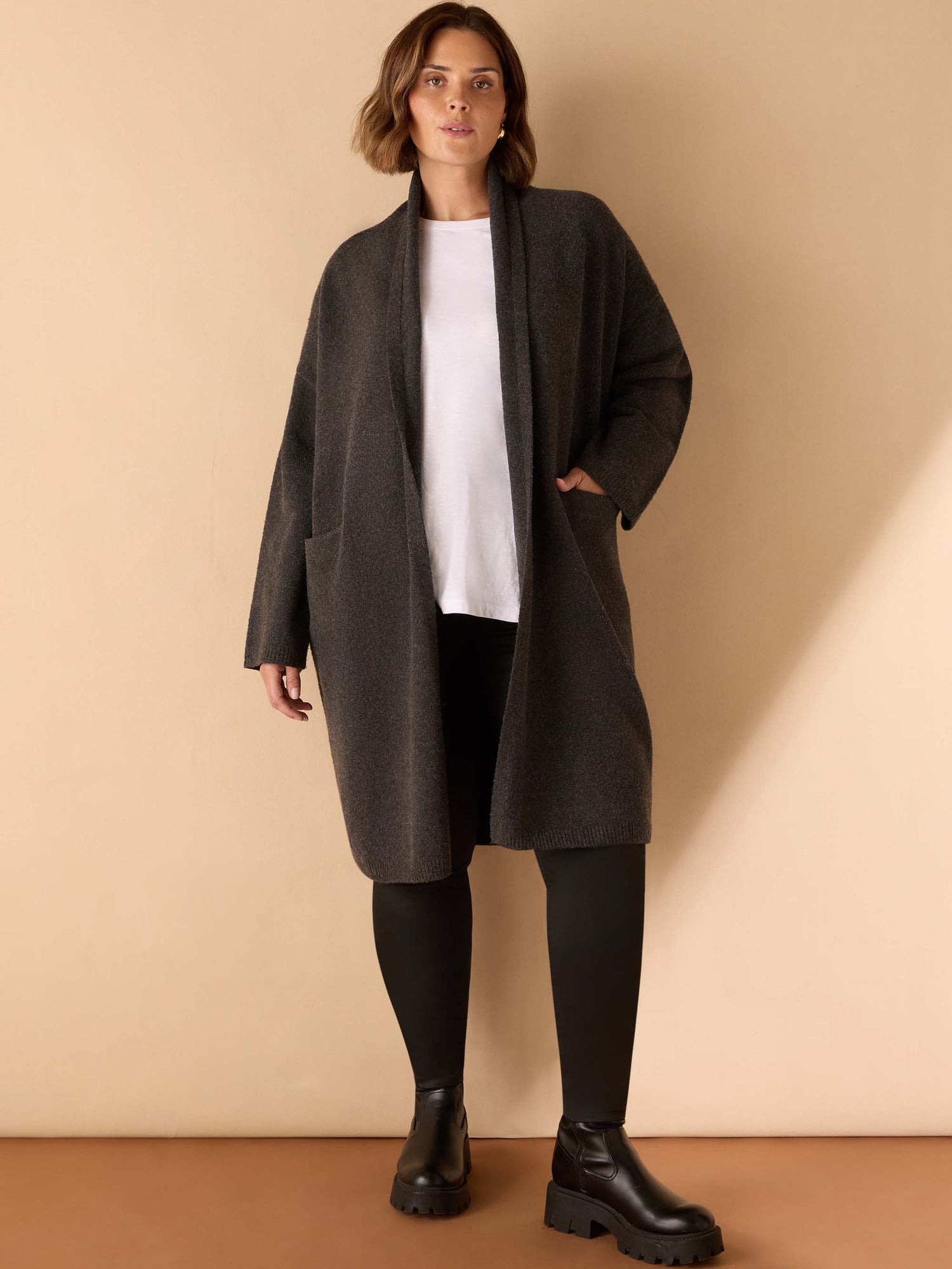Effortlessly combining the structure of a coat with the comfort of a cardigan, this Grey Coatigan features a clean edge-to-edge design for a sleek, minimalist look. Finished with practical patch pockets, it’s the perfect lightweight layer for transitional weather and everyday styling.