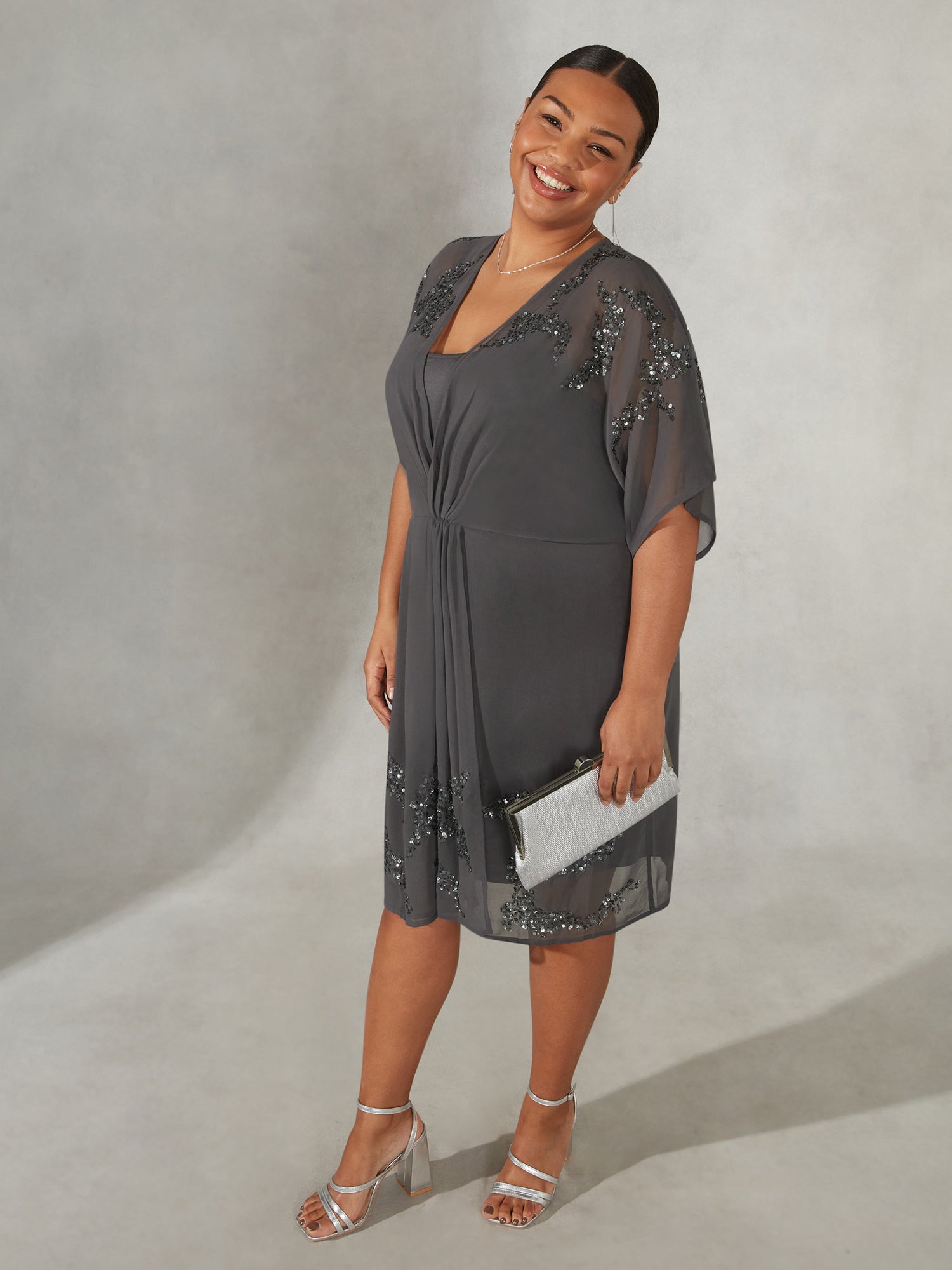 In a sophisticated grey, this embellished dress is cut from a beautiful woven fabric that moves beautifully and has clusters of tonal beads and sequins. With batwing sleeves and twist front detailing it has an elegant silhouette that’s so flattering, while a detachable camisole underneath provides that all-important coverage.