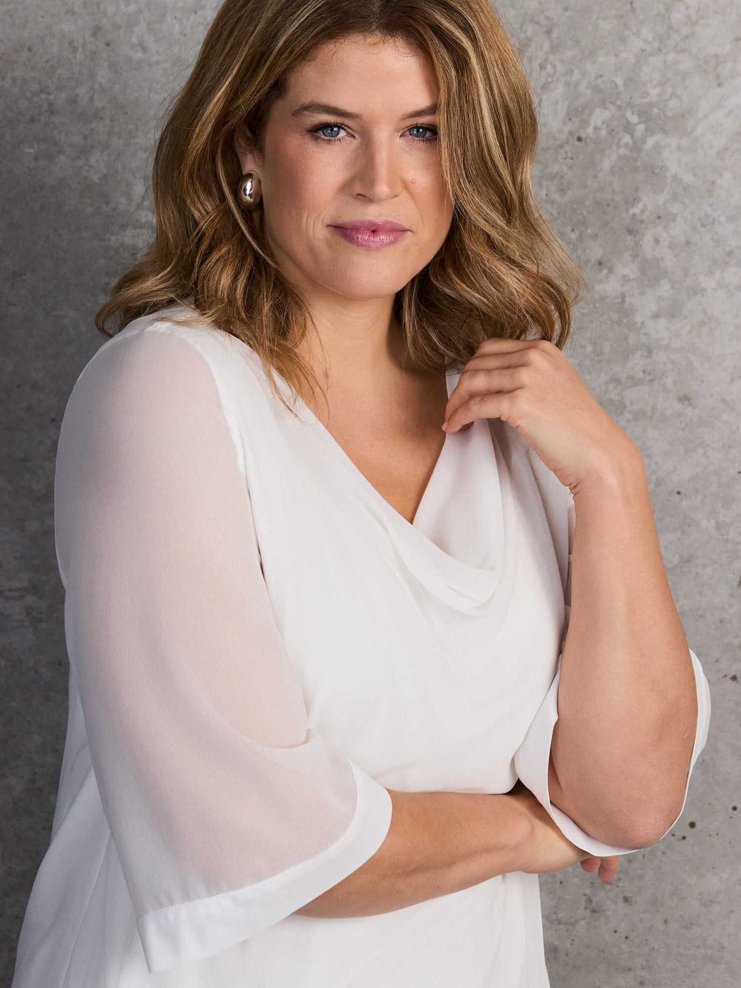 Delicately refined, this ivory cowl neck overlay features a flowing chiffon layer with a soft drape, elbow-length sleeves, and a cami lining for versatile styling. The elegant cowl neckline adds subtle sophistication, making it perfect for layering over tailored trousers or skirts for polished day-to-evening ensembles. Ideal for both formal occasions and everyday wear.