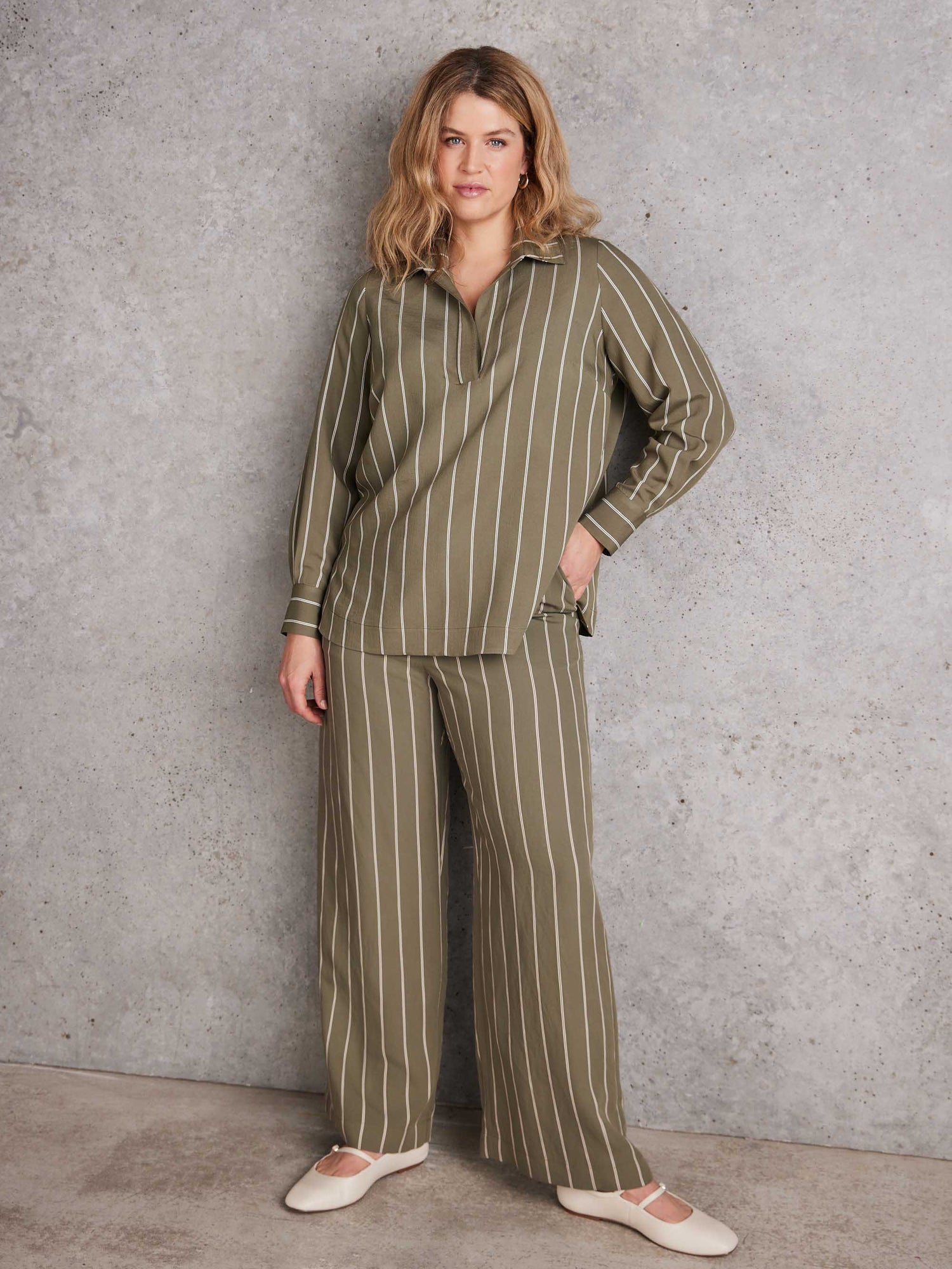 Designed with comfort and versatility in mind, these khaki striped trousers offer a relaxed yet considered silhouette. The wide leg creates an easy, flowing shape, while the drawstring waistband with an elasticated back ensures a comfortable, adjustable fit. Finished with side pockets and a fly front, they balance everyday practicality with a smart, modern look. The vertical stripe adds subtle structure, making them easy to dress up or down. Pair with the matching striped shirt for a coordinated co-ord, or style with simple knits and tops for effortless everyday wear.