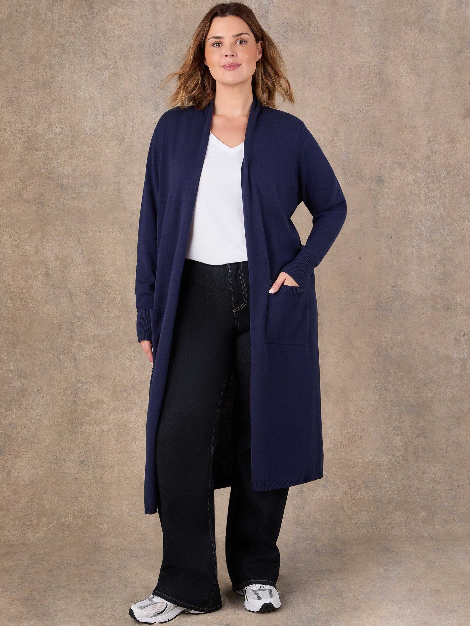 An effortless layering piece with a refined feel, this navy longline knitted cardigan is designed to sit beautifully over your everyday looks. The clean edge-to-edge front creates a flattering, streamlined line, while the soft midweight knit offers comfortable coverage without feeling heavy. Finished with practical front pockets and long sleeves, it works just as well over dresses as it does with tailored trousers — an easy, versatile layer you’ll reach for time and time again.