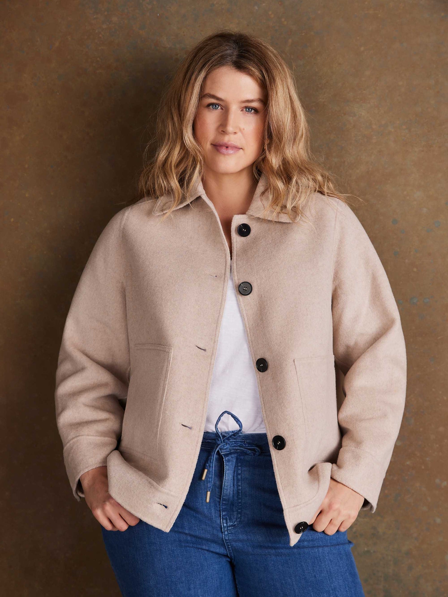 The Oatmeal Short Double Face Jacket offers a timeless blend of structure, softness and sophistication. Expertly crafted from a luxurious wool blend, its double-faced construction gives a smooth, refined finish inside and out. Featuring a button-through front, long sleeves and practical front pockets, it’s the perfect balance of function and polish. The short length and clean lines create a modern, versatile silhouette that layers effortlessly over knitwear, blouses or dresses. In a soft oatmeal hue, this jacket brings warmth and understated elegance to any look; a beautifully crafted piece you’ll reach for season after season.