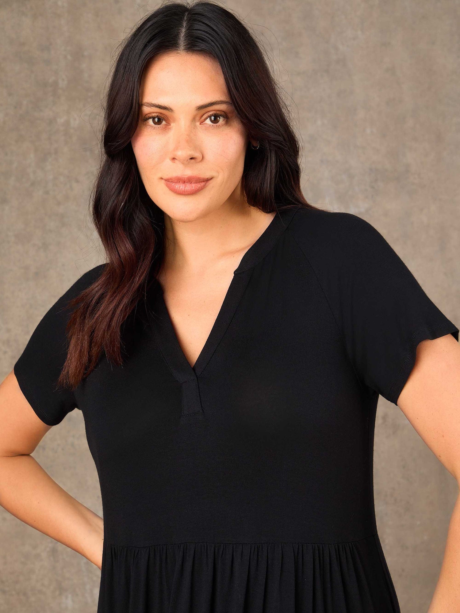 Softly patterned, this printed Nehru tiered maxi dress brings interest to an easy, wearable silhouette. The Nehru collar with a clean placket adds subtle structure, while raglan short sleeves offer comfortable coverage through the arm. A gently gathered waist flows into a tiered skirt, creating natural movement and a flattering drape. Designed with versatility in mind, it’s a refined piece that works beautifully for everyday wear and relaxed occasions alike. This dress is part of our petite collection, designed for those 5'3" and under.