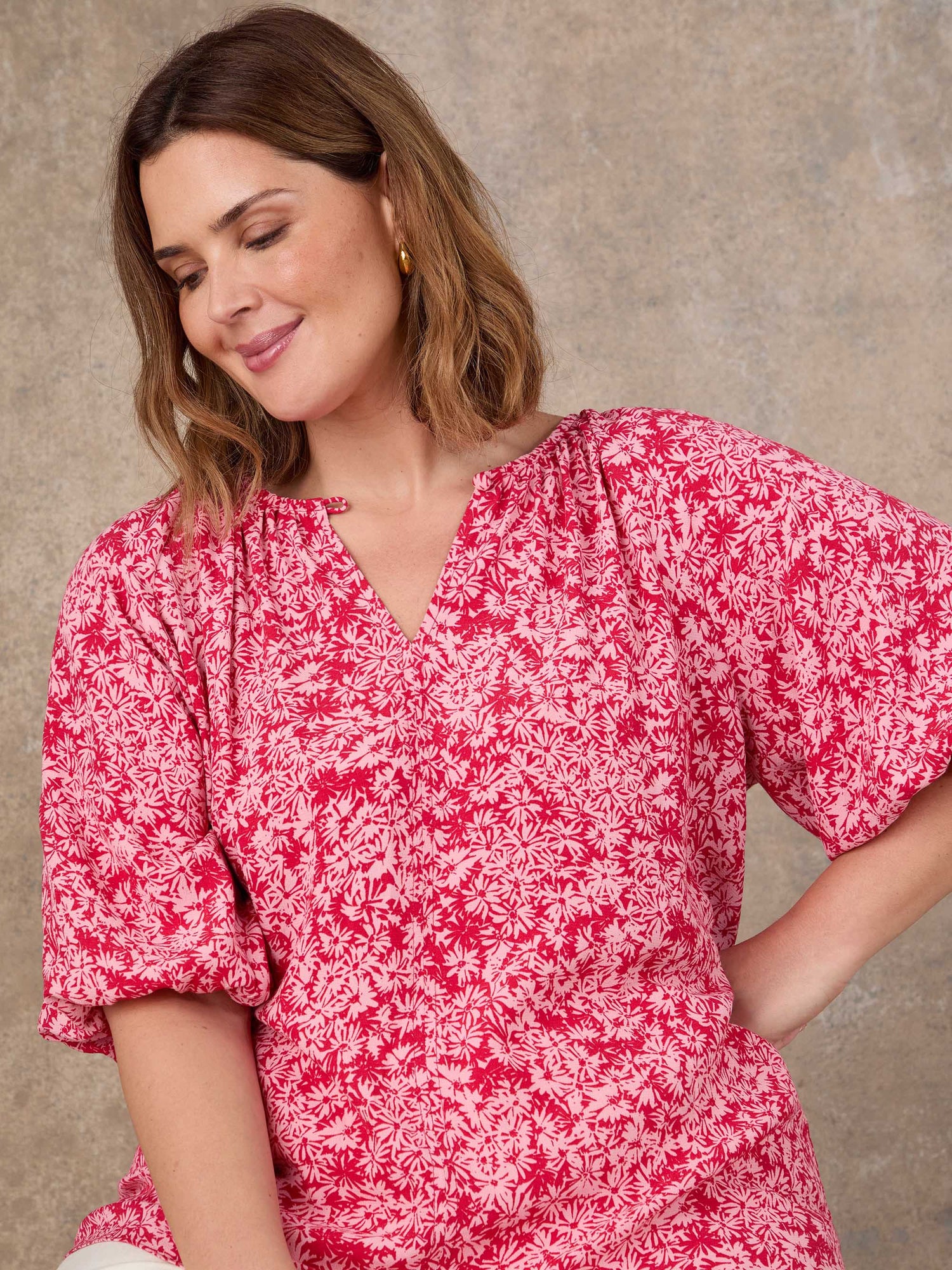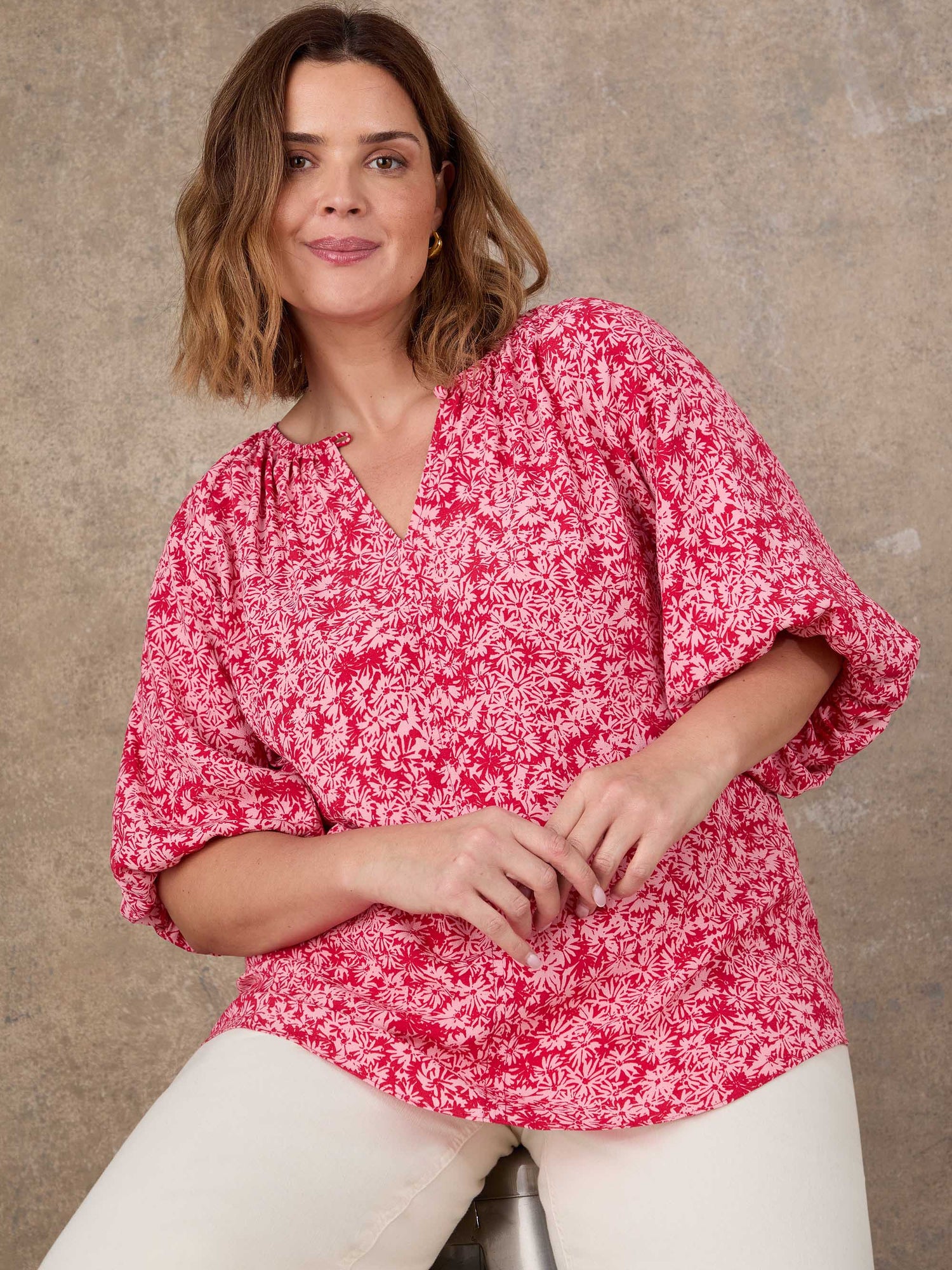 A beautifully easy blouse that feels polished without being formal. This pink ditsy style features a simple crew neckline and softly shaped raglan puff sleeves, creating a flattering, feminine silhouette. The ditsy print adds gentle detail, while the slip-on design keeps it effortless to wear. Easy to style with tailored trousers or skirts for smarter days, or with denim when you want a more relaxed look. A versatile piece that brings a refined feel to everyday dressing, without losing comfort or ease.