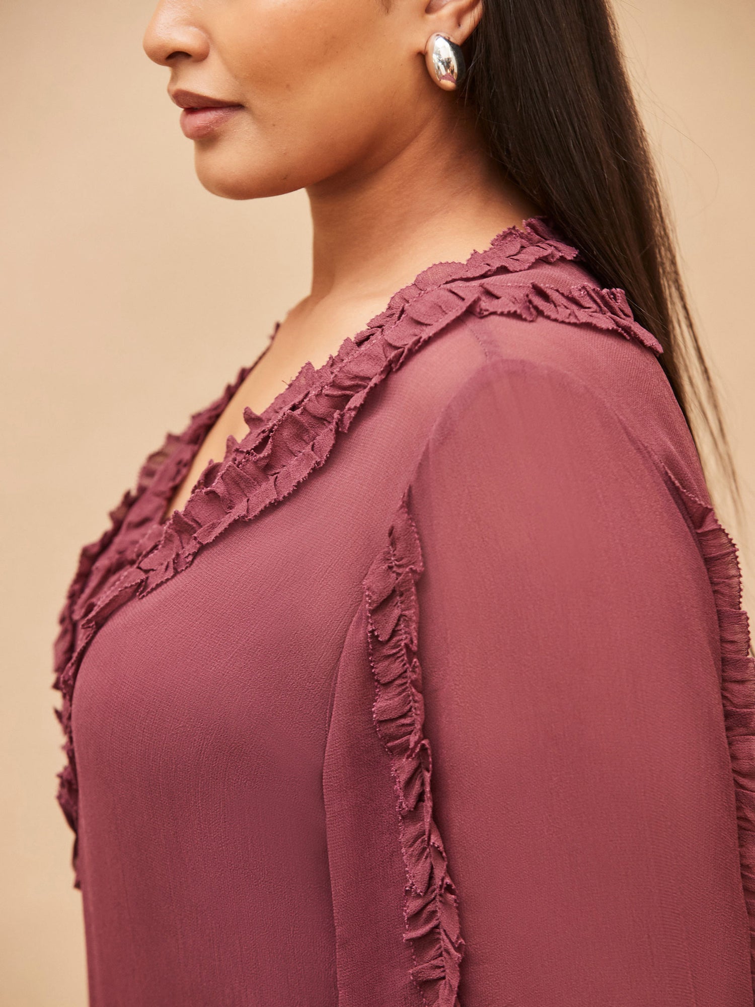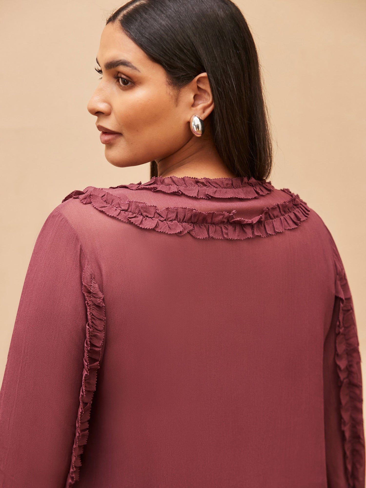 In a gorgeous burgundy this Frill Trim V Neck Blouse is the most perfect piece to take you through the colder seasons in style. With the ruffle neckline and sleeves that add so much detail and make this blouse feel so elegant to wear. The elasticated cuffs ensure this blouse fits you perfectly without any restrictions. It has a detachable jersey lining making sure it stays comfortable all day long. This blouse is perfect addition to your wardrobe and will last you for years to come.