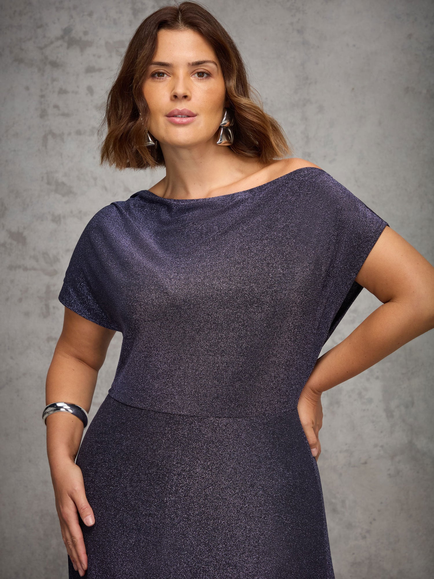 Shine at every occasion in this Purple Sparkle Asymmetric Maxi Dress, featuring a striking asymmetric neckline and pleated shoulder detail. Crafted from soft jersey sparkle fabric, it has a flattering waist seam and an A-line skirt that drapes beautifully, making it the perfect statement dress for evening events or special occasions.