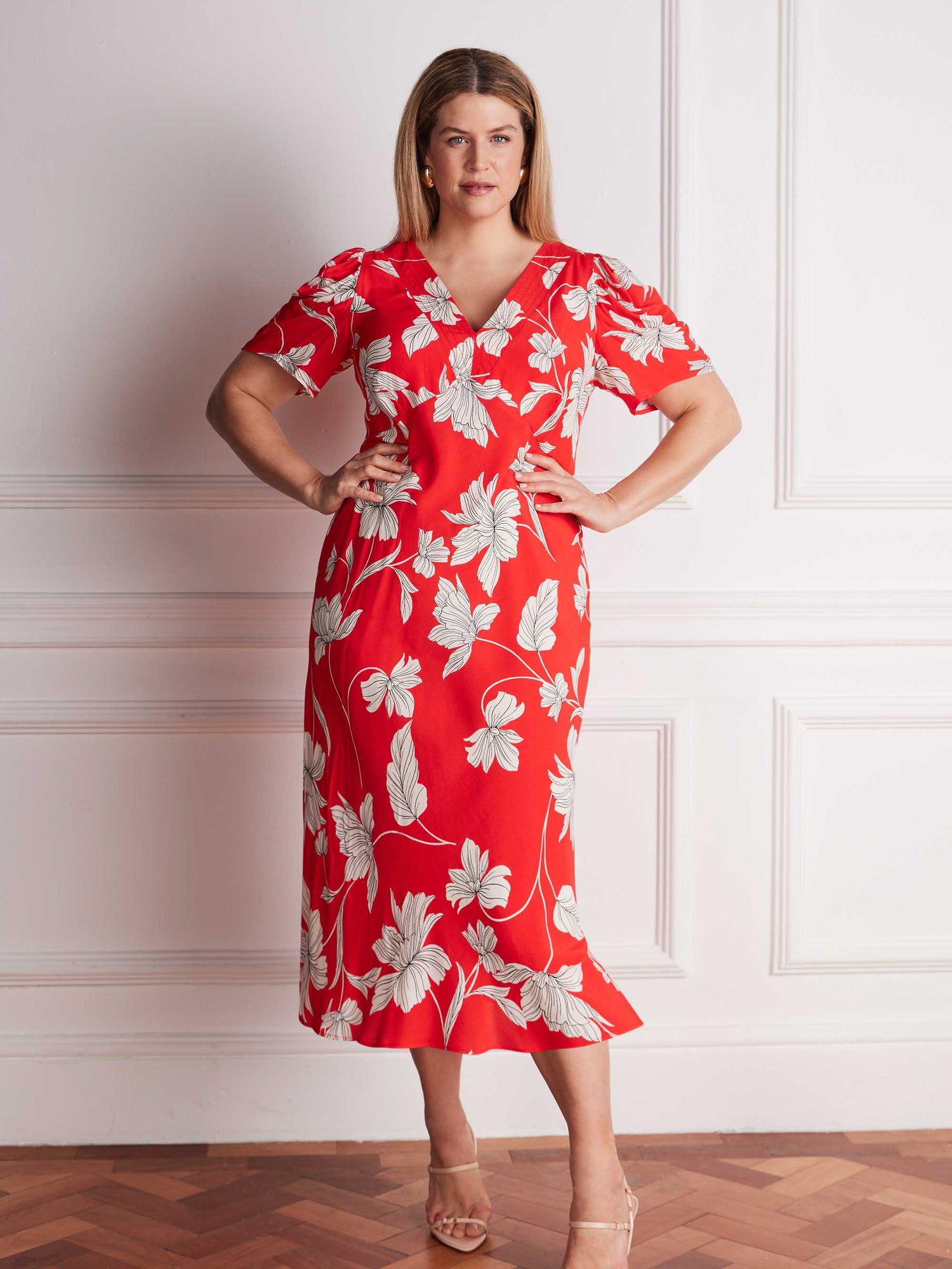Confident and feminine, this red floral midaxi dress is designed to make an effortless statement. The V-neckline creates a flattering frame, flowing into an empire seam that softly defines the silhouette. Gently draped puff sleeves add elegant movement and comfortable coverage, balancing the fluid skirt below. Easy to slip on, it’s perfect with neutral heels for occasions or styled with simple sandals for elevated daytime dressing.