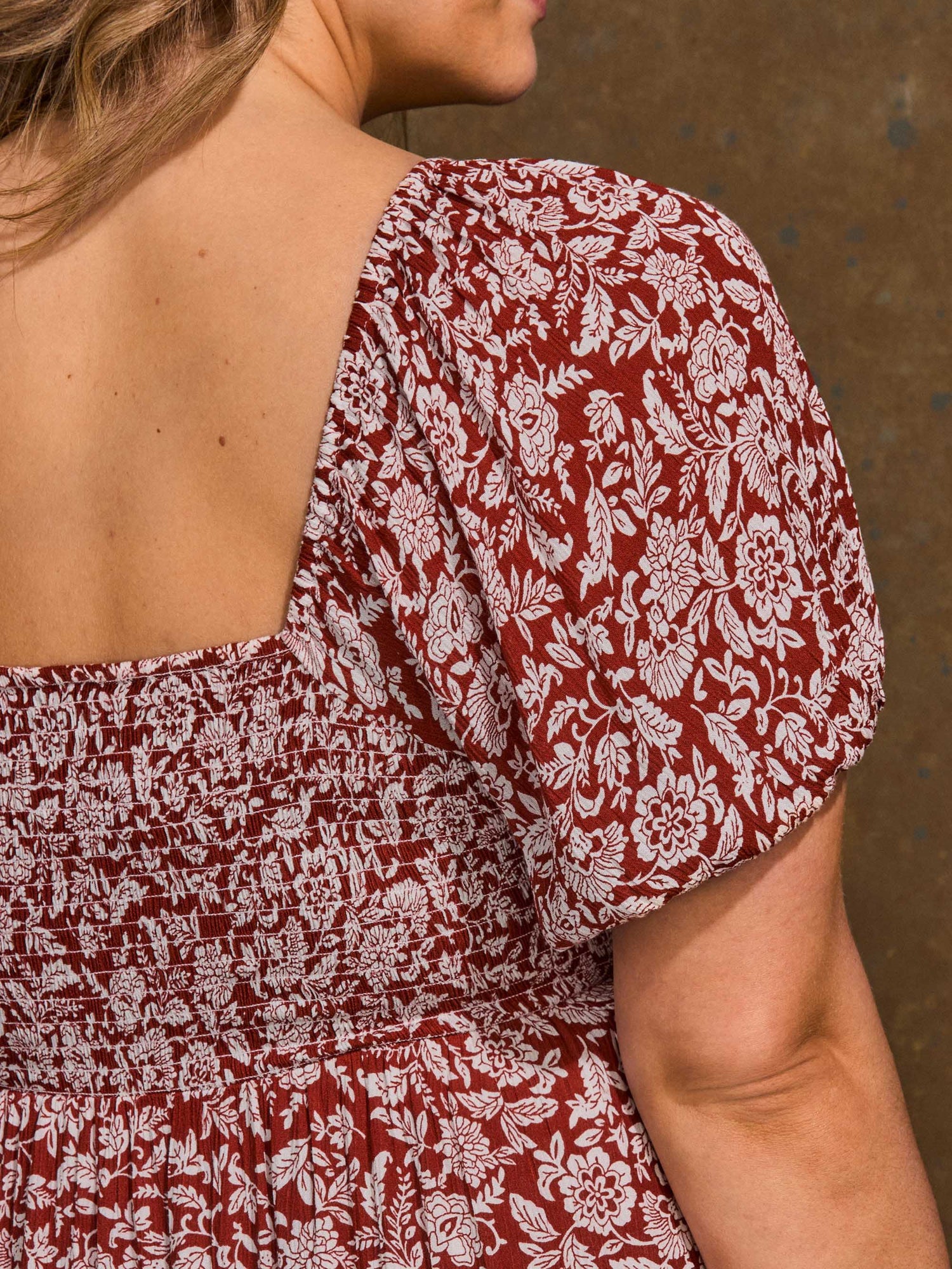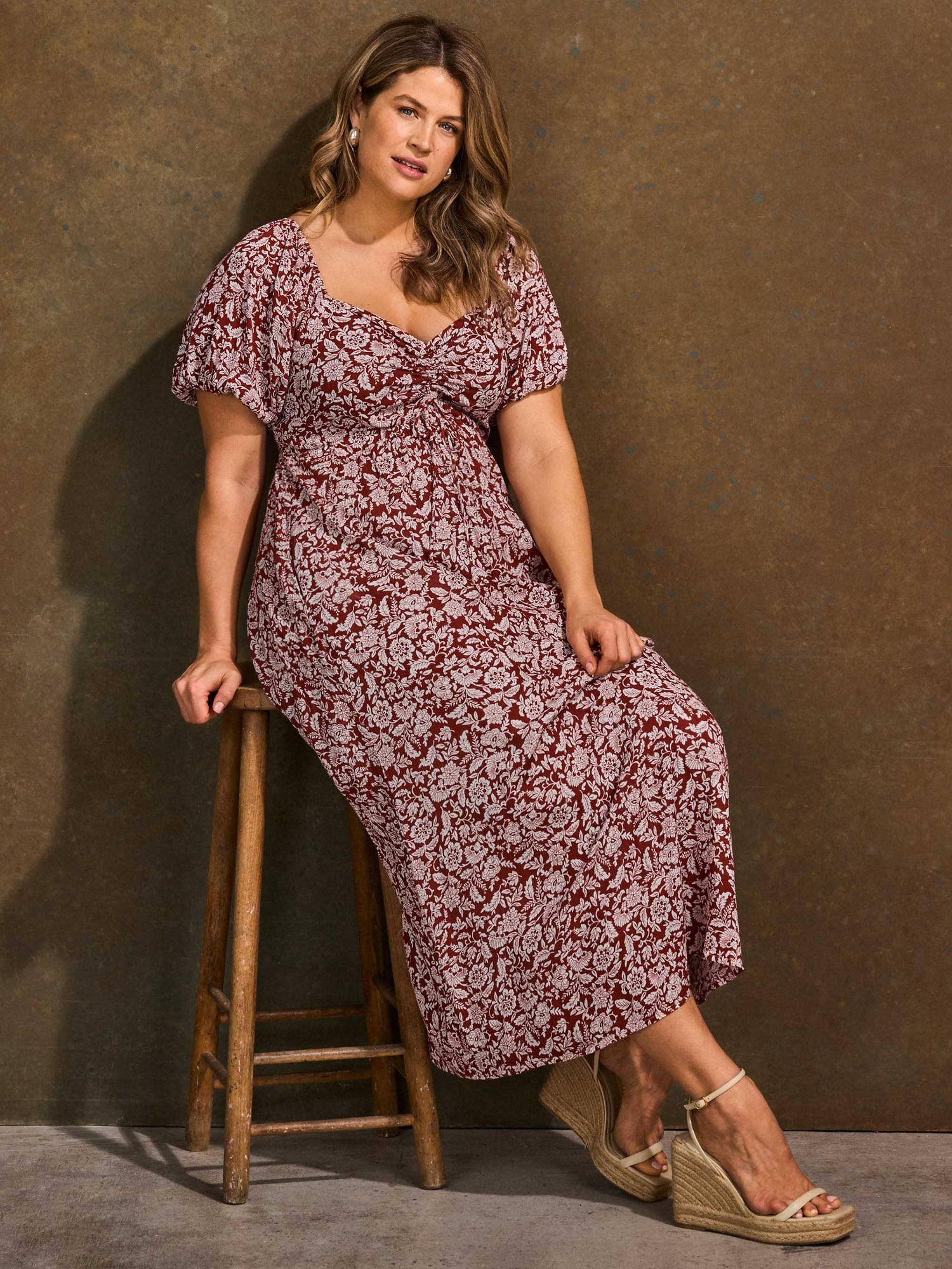 Warm and feminine, this rust floral print midaxi dress brings effortless charm to everyday and occasion dressing alike. The adjustable drawstring front allows you to shape the neckline to suit, while the shirred back bodice offers a comfortable, flexible fit. Soft puff sleeves add gentle volume through the shoulders, balanced by the fluid drape of the crinkle fabric. Finished with side seam pockets and an easy slip-on design, it’s a feel-good style you’ll reach for again and again.