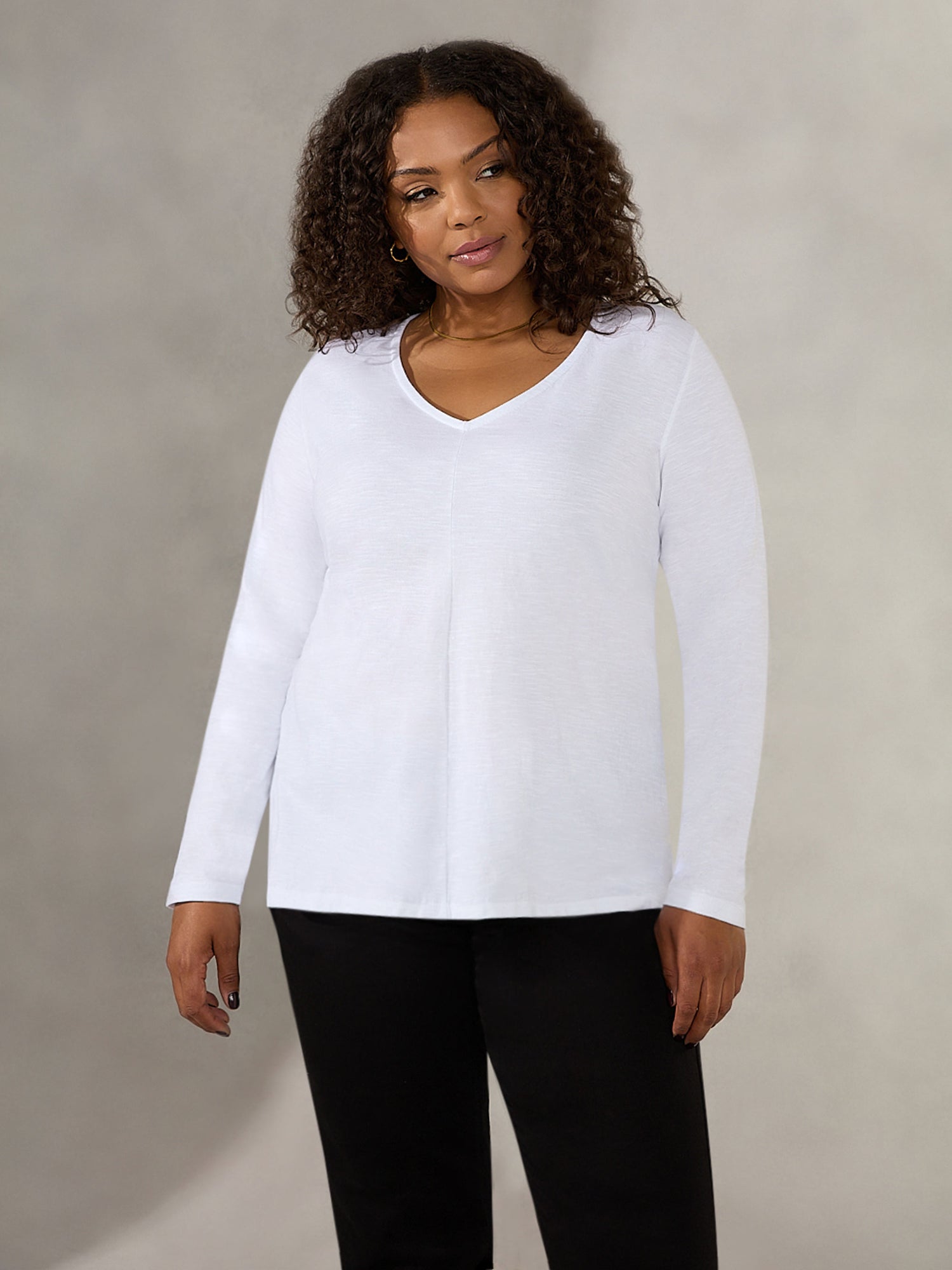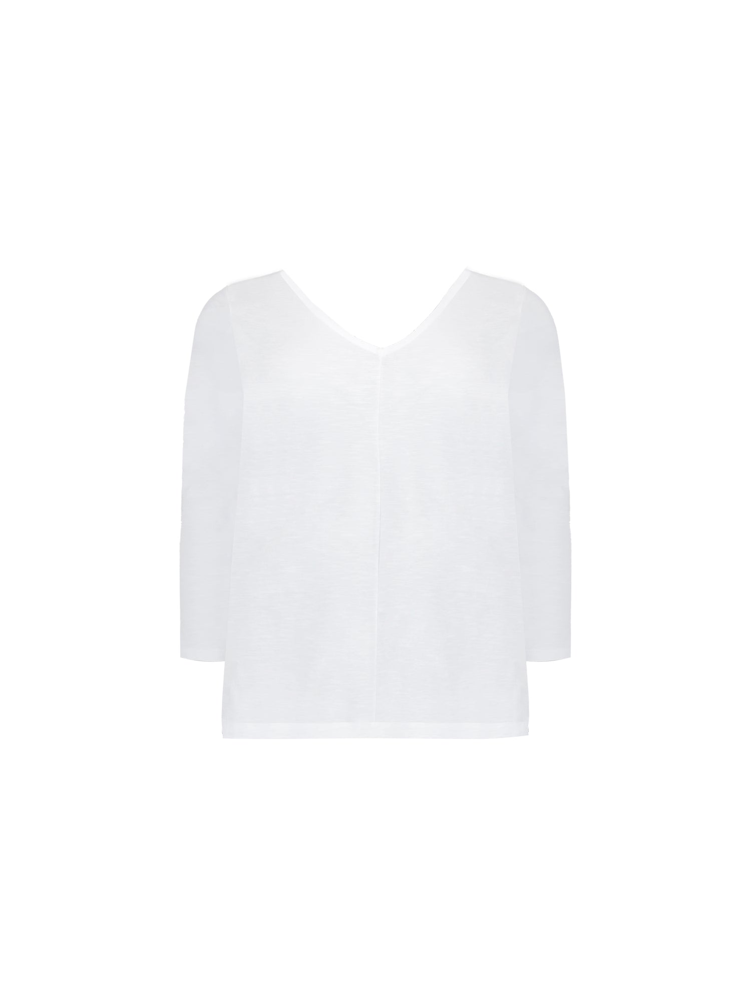 This easy-to-wear long-sleeved top, cut from 100% cotton, is designed to be the most flattering piece in your wardrobe. In the softest of white slub cottons, with an elegant V-neck and a centre front seam to give a gentle A-line silhouette to the body, it’s nice and loose on the tummy, and is the perfect basic staple piece that you’ll come back to time and time again.